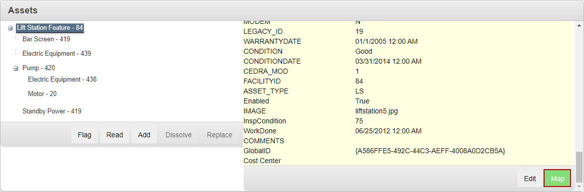 - Click Map at the bottom of the Attributes tab. The asset is highlighted on the map.