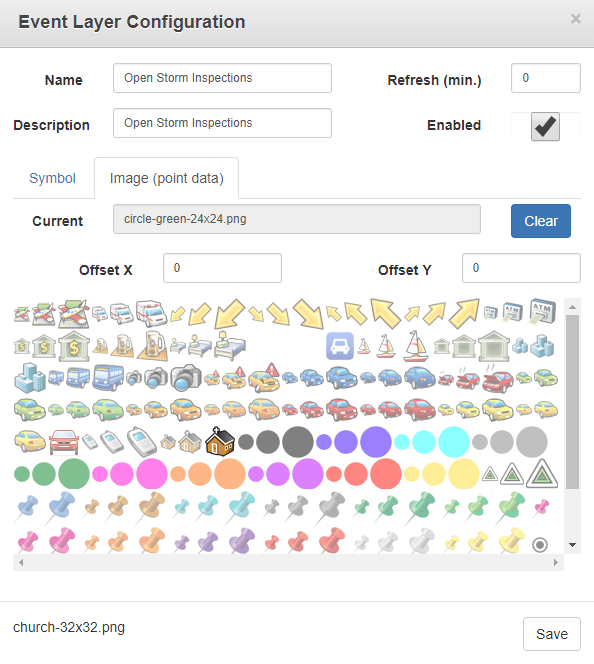 NOTE: The domain administrator can enable Esri's custom image symbols for event layers. See Enable Custom Image Symbology for Event Layers in Cityworks Server on MyCityworks.