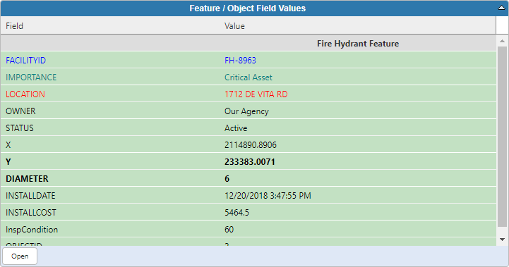 NOTE: The attributes displayed in the Feature / Object Values panel and its formatting are configured in Designer under GISAsset Groups > Asset Form Configuration for each asset type. See Add an Asset Type in the Designer for 15.8 Guide for more information.